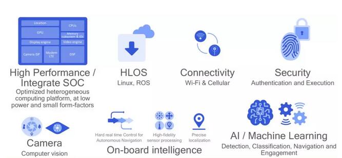 平台的硬件开发包涵盖了专门面向机器人打造的全新DragonBoard™ 845c开发板,它是基于Qualcomm SDA/SDM845 SoC而设计,并符合96Boards开源硬件规范,可以支持中间层的一系列扩展。该开发包的可选组件包括连接板;支持出色的高分辨率照片、4K视频拍摄,以及人体和物体的AI辅助侦测与识别的图像摄像头;利用视觉即时定位与地图构建(vSLAM)进行路径规划和避障的追踪摄像头;用于导航的立体摄像头;以及即使在弱光条件下也可实现人、动作和物体侦测的TOF摄像头。