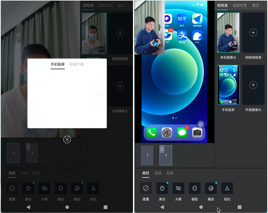 手机投屏:手机扫码下载专用 APP,在手机上打开摄像头,即可在聆镜视频直播一体机上投屏手机的拍摄画面(支持前后摄像头转换),并且支持 720P 和 1080P 两种清晰度切换。